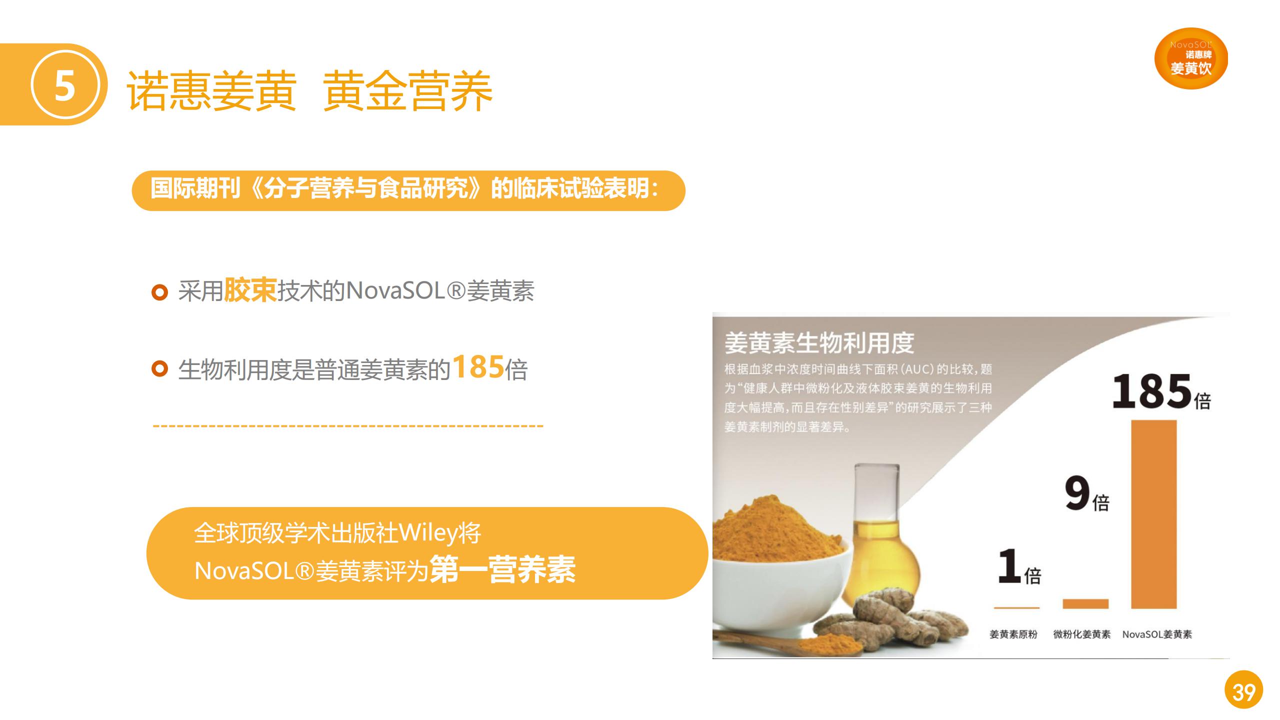 2018年发表于《Journal of Integrative Medicine》的文章对主要姜黄产品的生物利用度做了比较,只有三款产品提升生物利用度在100倍以上,诺惠(NovaSOL®)姜黄以185倍生物利用度夺得头筹,不仅如此,诺惠姜黄在峰浓度和达峰时间也具有明显优势。